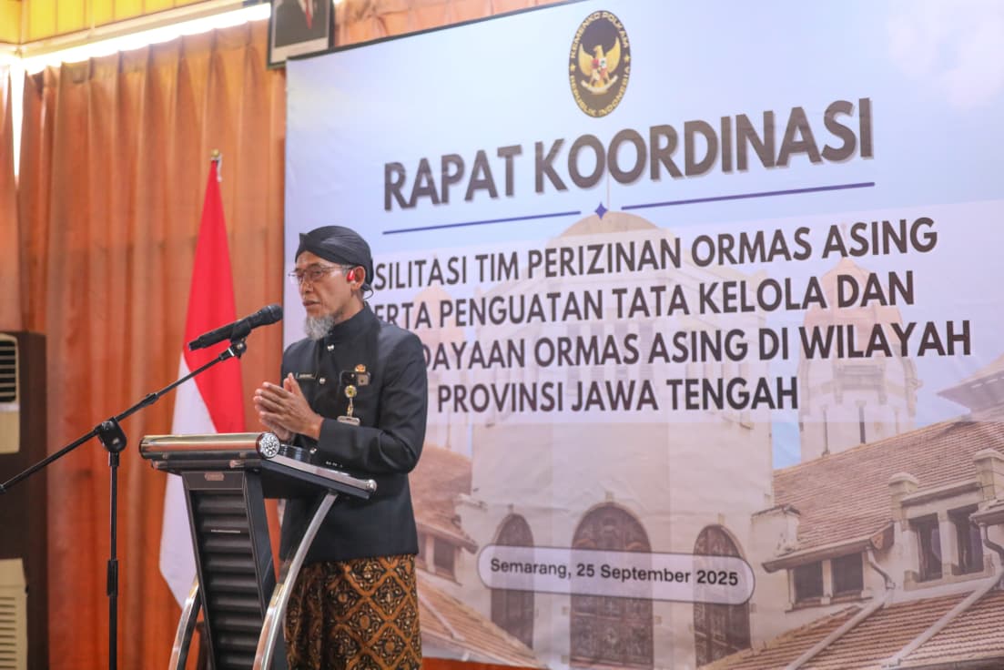 Informasi itu disampaikan Sekretaris Daerah (Sekda) Jawa Tengah, Sumarno, saat membuka Rapat Koordinasi Fasilitasi Tim Perizinan Ormas Asing dan Penguatan Tata Kelola di Hotel Novotel Semarang, Kamis (25/9/2025).