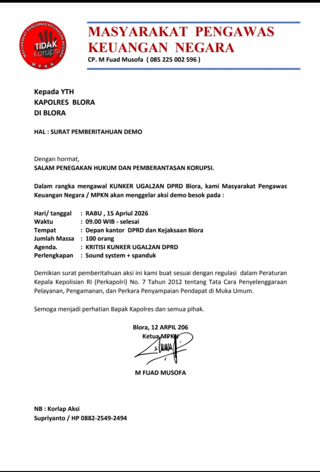 Dalam surat tersebut, MPKN menyatakan akan menggelar aksi unjuk rasa pada Rabu, 15 April 2026, mulai pukul 09.00 WIB hingga selesai. Aksi rencananya akan dipusatkan di depan kantor DPRD Blora dan Kejaksaan Blora, dengan melibatkan sekitar 100 massa.