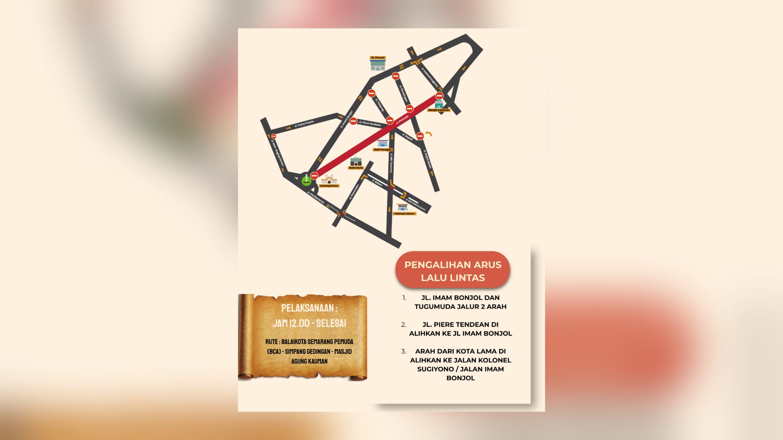Guna kelancaran prosesi acara, Dinas Perhubungan atau Dishub Kota Semarang bersama Satlantas Polrestabes Semarang akan memberlakukan pengalihan arus lalu lintas mulai pukul 12.00 WIB hingga kegiatan selesai. Sejumlah ruas jalan seperti Jalan Pemuda hingga kawasan Kauman akan dialihkan sementara mengikuti pergerakan rombongan kirab.