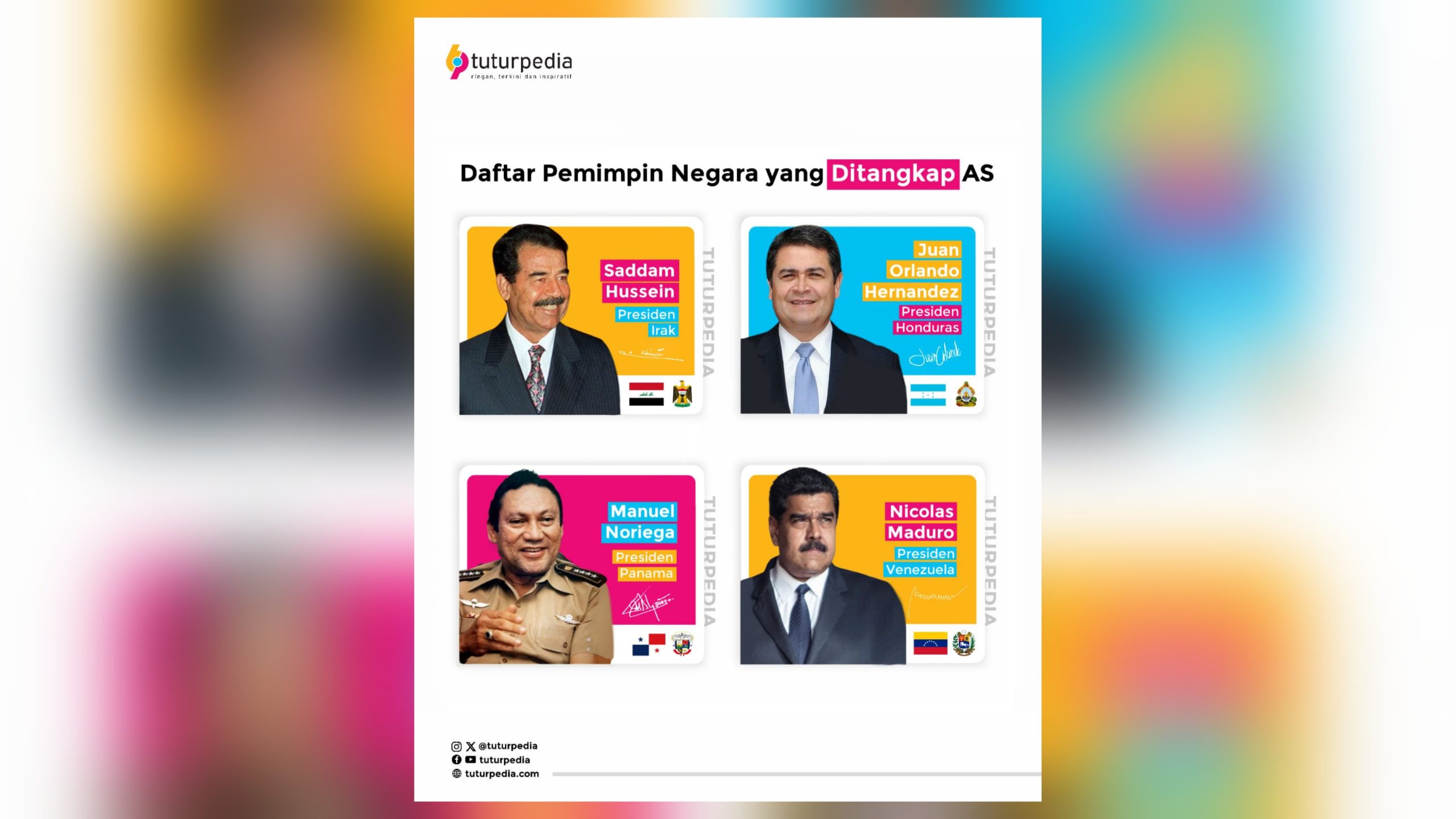 Tuturpedia.com — Amerika Serikat tercatat beberapa kali melakukan penangkapan terhadap pemimpin negara asing dalam berbagai operasi militer dan penegakan hukum lintas negara. Sepanjang beberapa dekade terakhir, setidaknya empat kepala negara pernah ditangkap langsung oleh otoritas AS atau dengan keterlibatan dominan Washington. Penangkapan tersebut berlangsung dalam konteks dan latar belakang yang berbeda, mulai dari invasi militer hingga operasi keamanan internasional.