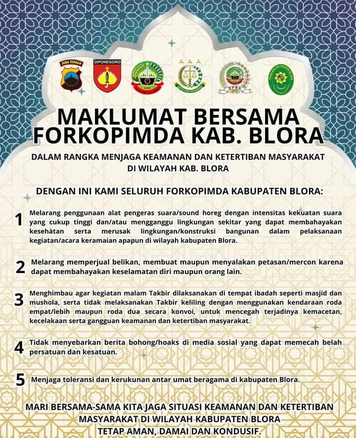 Melalui maklumat bersama ini, Forkopimda mengajak seluruh masyarakat Kabupaten Blora untuk bersama-sama menjaga situasi keamanan dan ketertiban agar tetap aman, damai, dan kondusif.