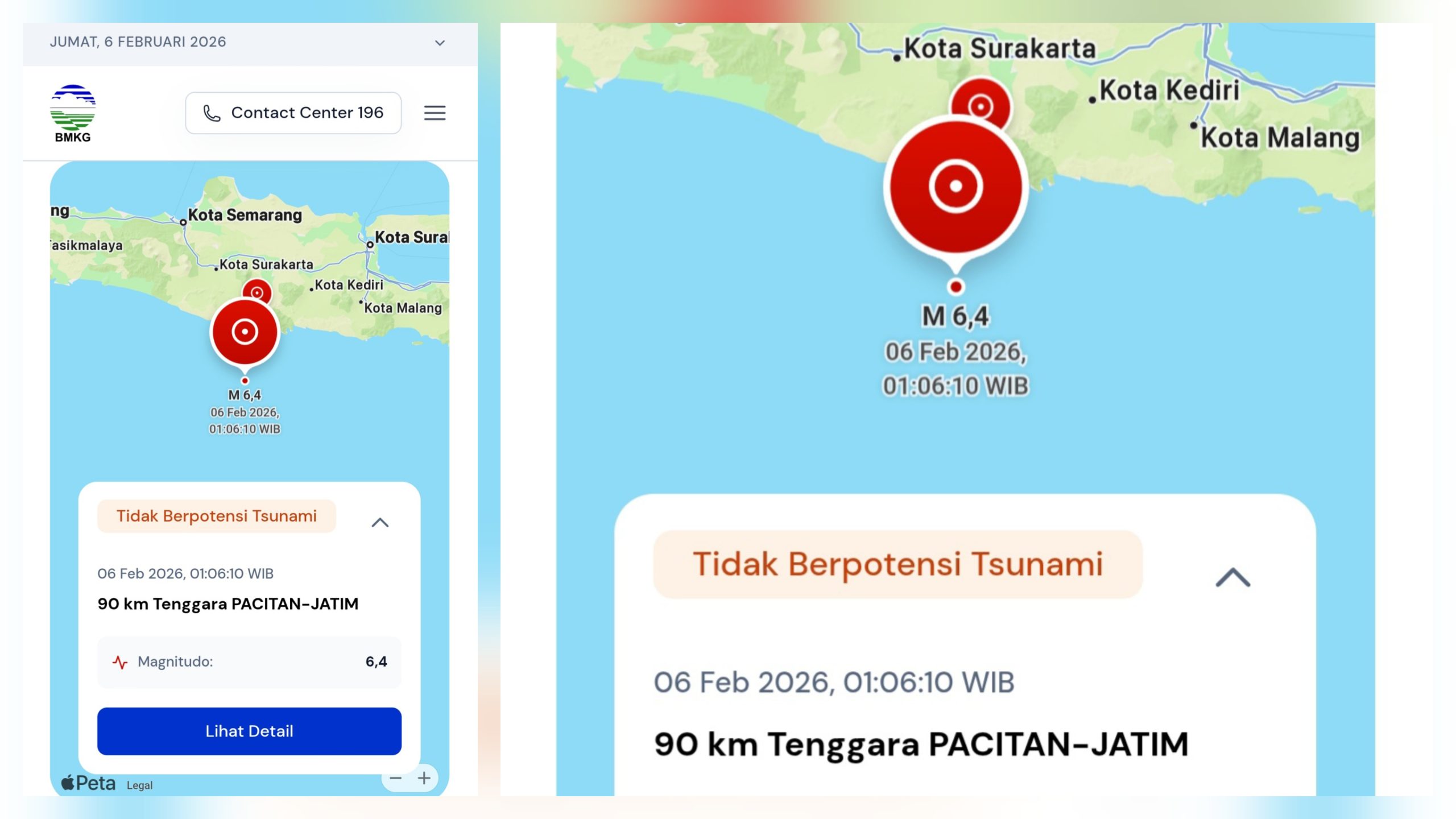 Tuturpedia.com — Pacitan, Jawa Timur, diguncang gempa bumi bermagnitudo 6,4 pada Jumat dini hari, 6 Februari 2026. Gempa terjadi sekitar pukul 01.06 WIB dan membuat warga terbangun dari tidur akibat guncangan yang cukup kuat. Berdasarkan data Badan Meteorologi, Klimatologi, dan Geofisika (BMKG), pusat gempa berada di laut selatan Jawa.