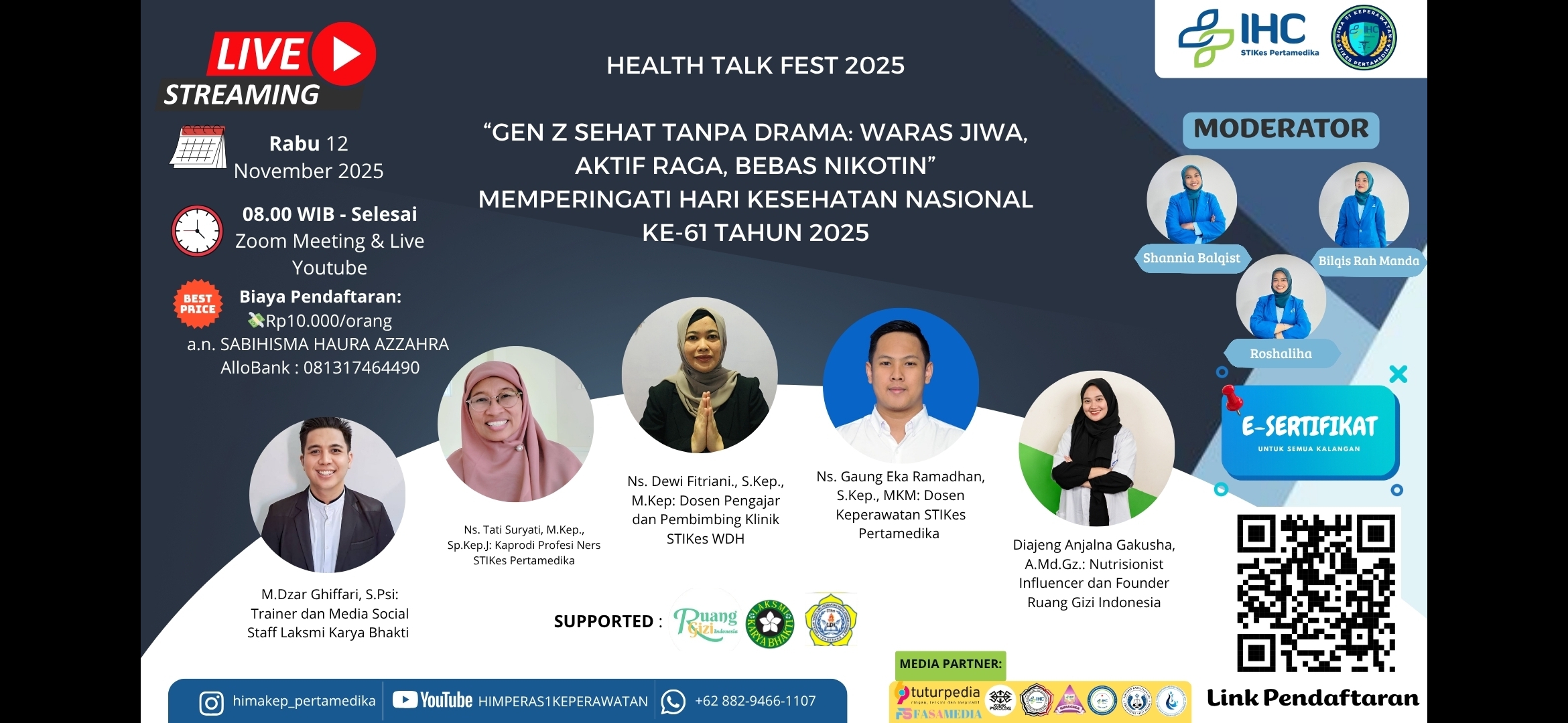 Semarang, Tuturpedia.com – Dalam rangka memperingati Hari Kesehatan Nasional (HKN) ke-61 Tahun 2025, Himpunan Mahasiswa (HIMA S1) Keperawatan STIKes Pertamedika akan menggelar kegiatan Health Talk Fest 2025 bertema “Gen Z Sehat Tanpa Drama: Waras Jiwa, Aktif Raga, Bebas Nikotin”. Acara ini dijadwalkan berlangsung pada Rabu, 12 November 2025 mulai pukul 08.00 WIB melalui Zoom Meeting dan siaran langsung YouTube.