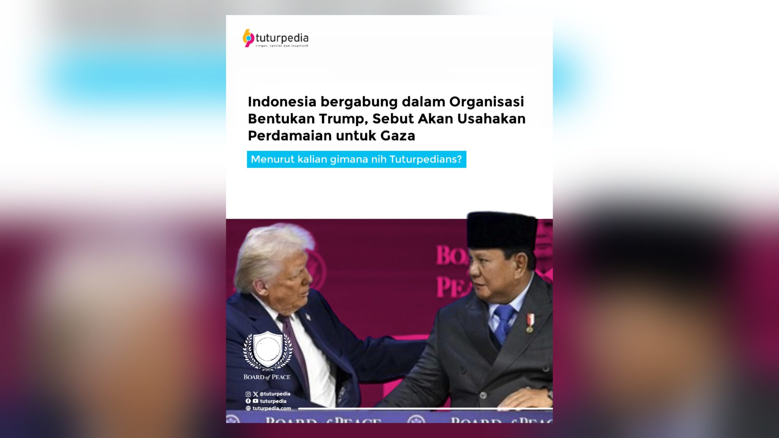 Tuturpedia.com — Indonesia resmi bergabung dalam Dewan Perdamaian (Board of Peace), sebuah inisiatif internasional yang diluncurkan dalam rangkaian World Economic Forum (WEF) 2026 di Davos, Kamis (22/1). Keikutsertaan Indonesia menandai langkah diplomatik baru untuk mendorong stabilitas kawasan konflik, khususnya dalam mendukung upaya perdamaian dan rekonstruksi Gaza.