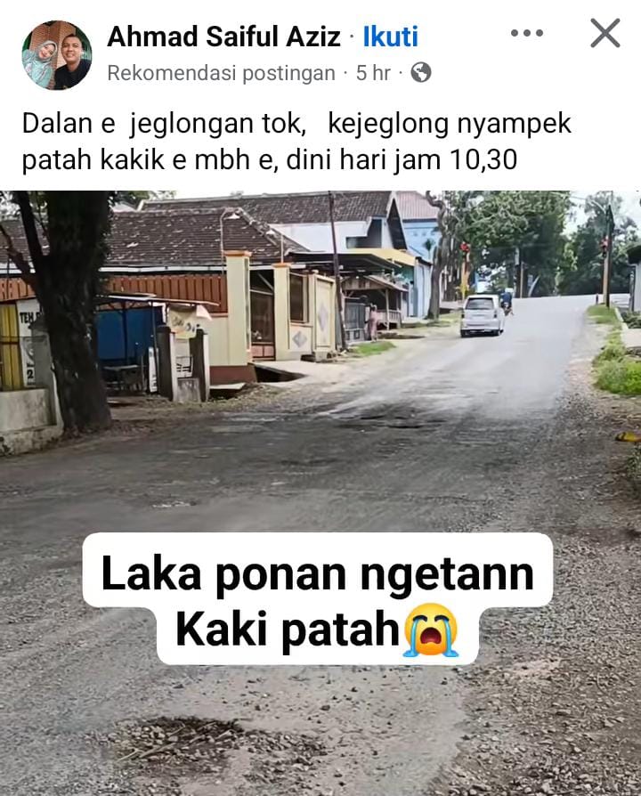 Kabar memprihatinkan ini viral setelah diunggah oleh akun Facebook Ahmad Saiful Aziz. Dalam unggahannya, ia membagikan foto kondisi jalan yang dipenuhi “jeglongan” atau lubang dalam berbagai ukuran yang sangat membahayakan pengendara, terutama saat malam hari.