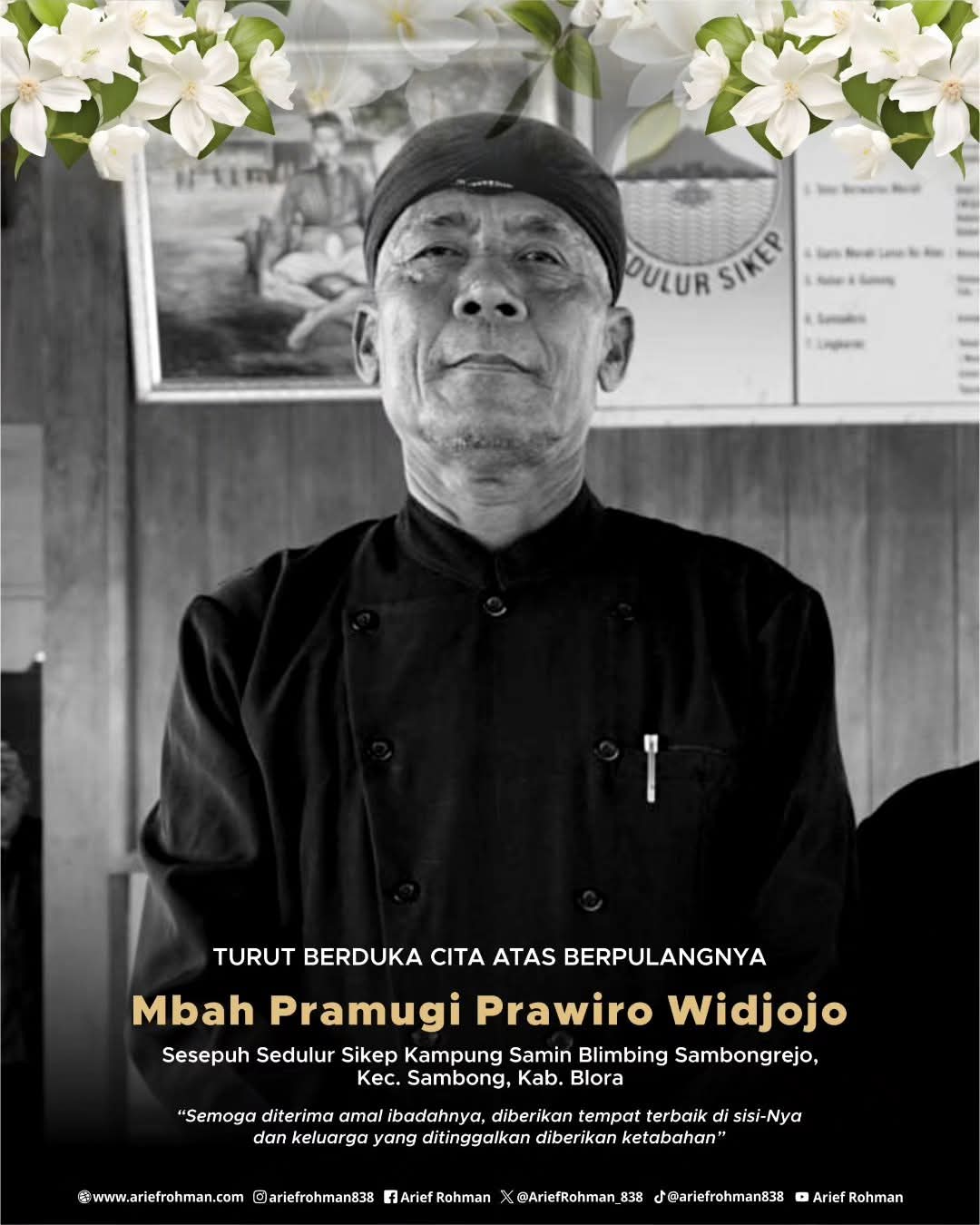“Swargi langgeng Mbah Pramugi. Nderek bela sungkawa atas berpulangnya orangtua kami, tokoh adat kami, sesepuh kami, sesepuh Sedulur Sikep Desa Wisata Kampung Samin Sambongrejo, Kecamatan Sambong, Kabupaten Blora. Mbah Pramugi Prawiro Widjojo,” ungkap Gus Arief sapaan akrab Bupati Blora, melalui akun Medsos resminya.