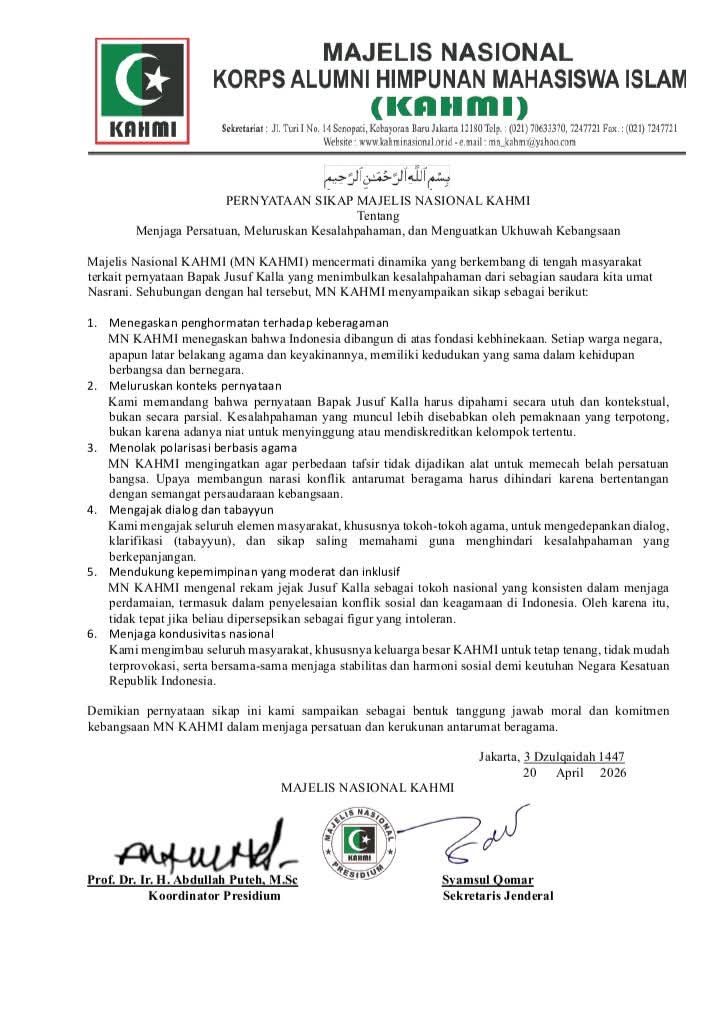 Melalui pernyataan ini, KAHMI berharap polemik yang berkembang dapat segera mereda dan masyarakat kembali fokus pada penguatan persatuan nasional di tengah keberagaman.