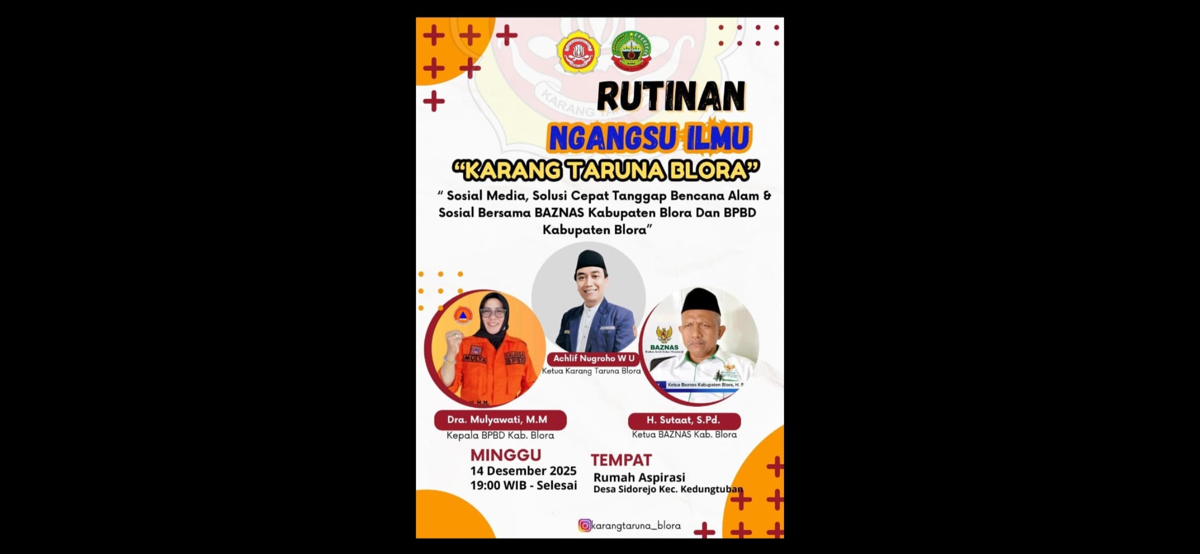 Acara yang diselenggarakan pada Minggu, 14 Desember 2025, pukul 19:00 WIB hingga selesai, ini menjadi ajang kolaborasi strategis dengan dua institusi penting di Kabupaten Blora: Badan Penanggulangan Bencana Daerah (BPBD) dan Badan Amil Zakat Nasional (BAZNAS).