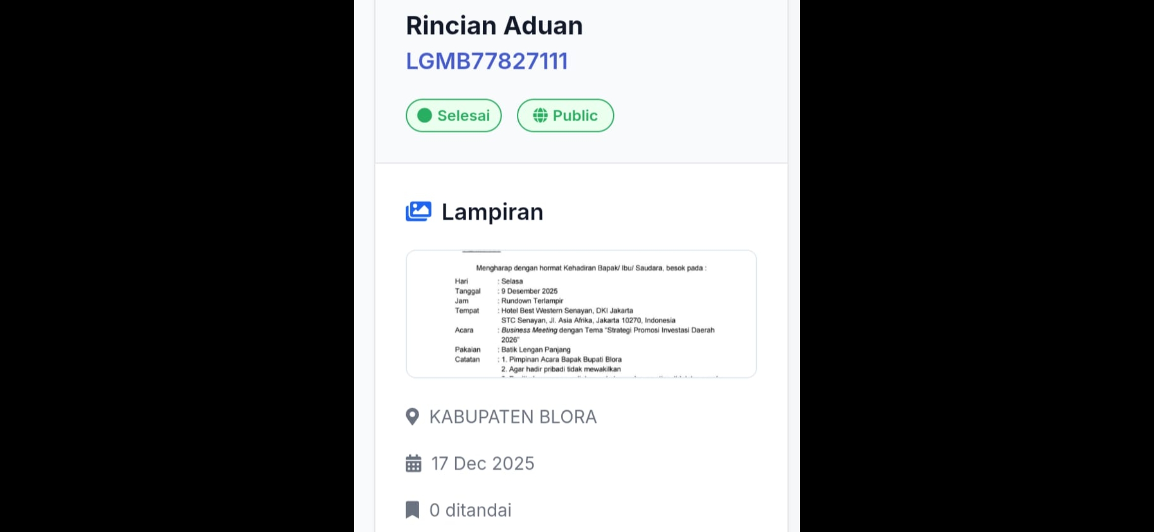 Dalam aduan pada (17/12), yang tercatat dengan nomor LGMB77827111 dan berstatus selesai serta bersifat publik, Forum Migas Blora menegaskan bahwa Kabupaten Blora memiliki potensi gas bumi yang strategis untuk dikembangkan menjadi Compressed Natural Gas (CNG) sebagai energi alternatif pengganti LPG dan BBM.