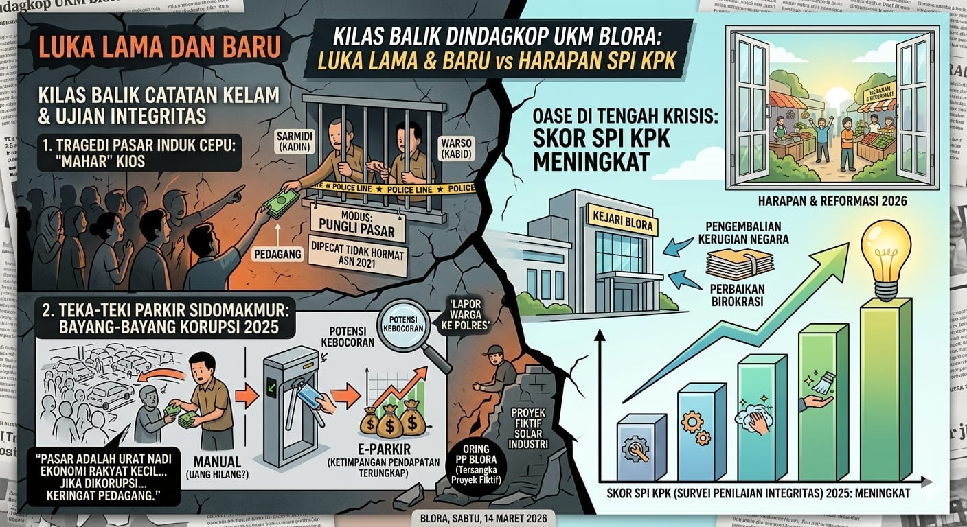 Blora, Tuturpedia.com – Sektor perdagangan di Kabupaten Blora tampaknya masih menjadi lahan basah yang rawan praktik lancung. Kilas balik perjalanan Dinas Perdagangan, Koperasi, dan UKM (Dindagkop UKM) Blora dalam beberapa tahun terakhir diwarnai oleh drama hukum yang menjerat pejabat teras hingga dugaan kebocoran pendapatan daerah di sektor perparkiran. Sabtu, (14/03/2026).