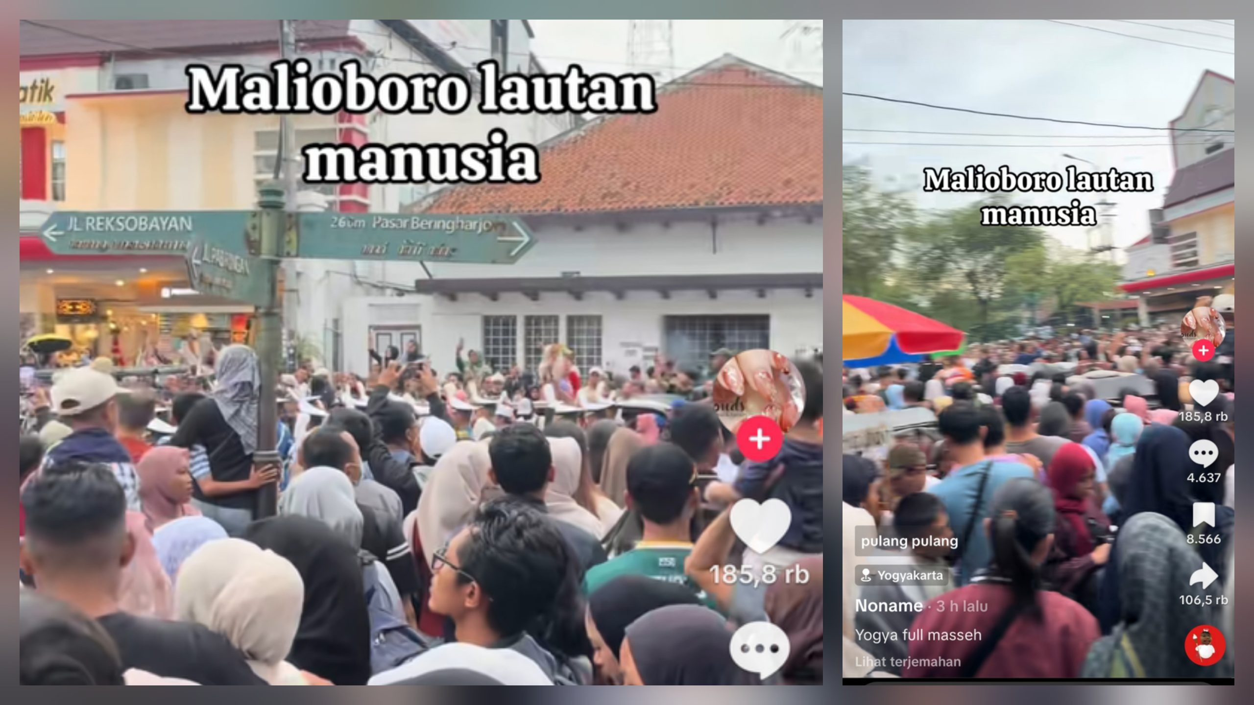 Unggahan akun TikTok @trissadhea yang beredar luas menunjukkan arus pejalan kaki yang tidak terputus sepanjang kawasan utama Malioboro. Dalam rekaman itu, terlihat pengunjung hampir tak berjarak satu sama lain, sehingga berjalan pun menjadi tantangan tersendiri bagi banyak orang. “Yogya edisi liburan. Malioboro lautan manusia,” ujar narator dalam video yang kini ramai dikomentari netizen.
