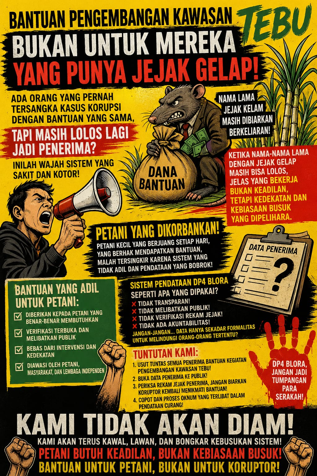 Poster yang beredar luas ini menggambarkan kontras tajam antara sosok petani yang memegang tebu dengan kepalan tangan kuat melawan deretan pria berjas yang duduk di atas tumpukan uang. Narasi utama yang diusung adalah penolakan terhadap skema bantuan yang dianggap tidak tepat sasaran.