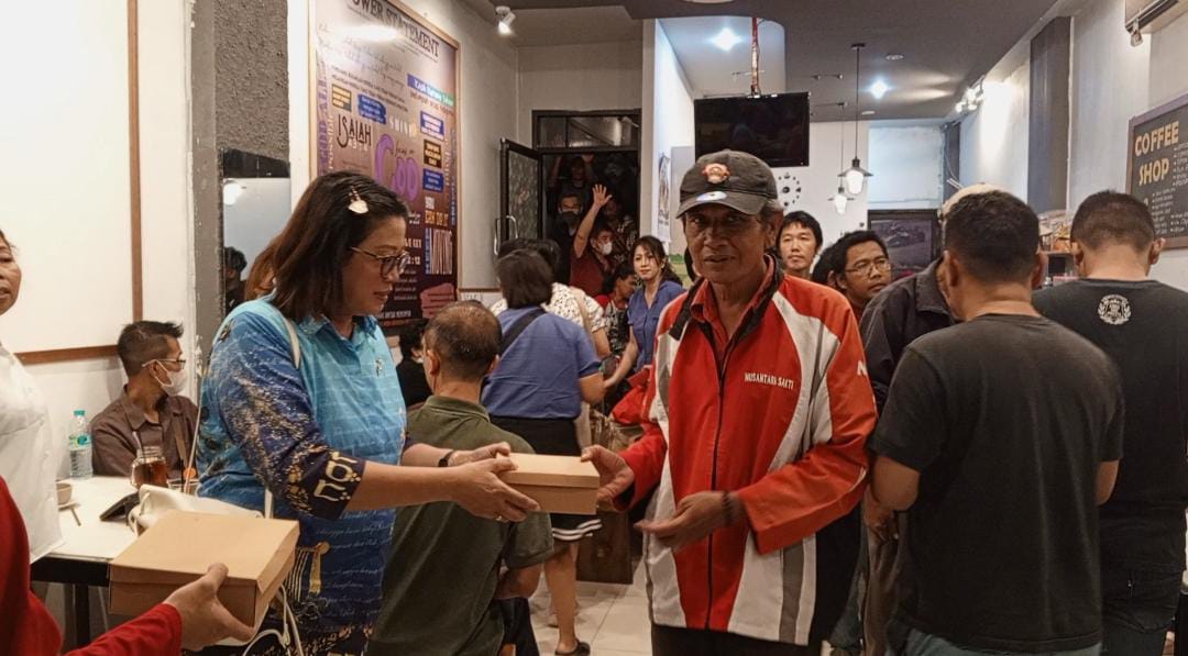Semarang, Tuturpedia.com – Bakal calon Wakil Wali Kota Semarang, Fienthy Eko Wati bagikan ratusan makan gratis bagi rakyat tidak mampu, usai lakukan ibadah bersama, yang dipimpin Pendeta Samuel, di kantor sekretariat Yayasan Generasi Emas jalan Sriwijaya kota Semarang, Senin (3/6/2024) malam.