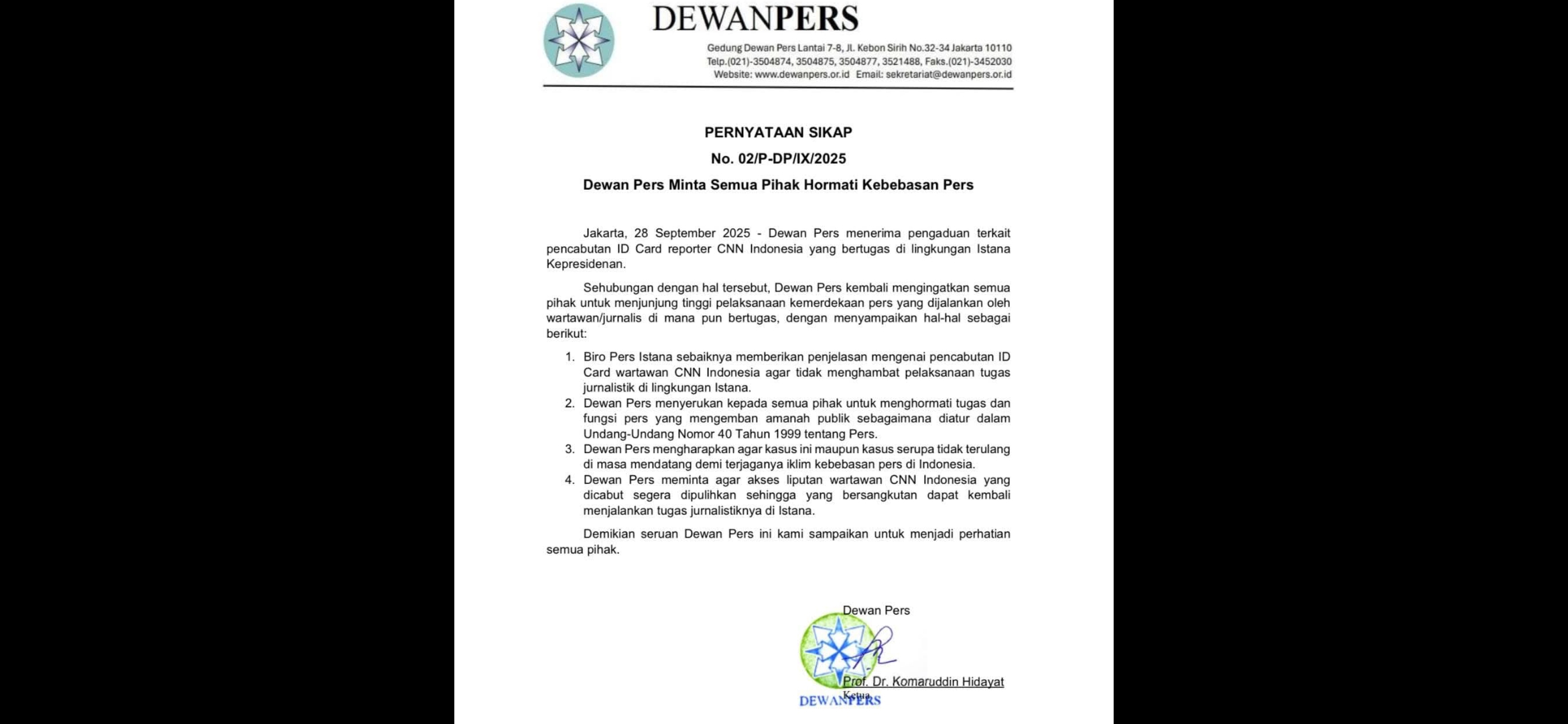 Jakarta, Tuturpedia.com — Dewan Pers menyikapi serius pengaduan terkait pencabutan ID Card seorang reporter CNN Indonesia yang bertugas di lingkungan Istana Kepresidenan. Insiden ini menimbulkan kekhawatiran besar akan terhambatnya kemerdekaan pers, sebuah pilar penting demokrasi. Minggu, (28/09/2025).