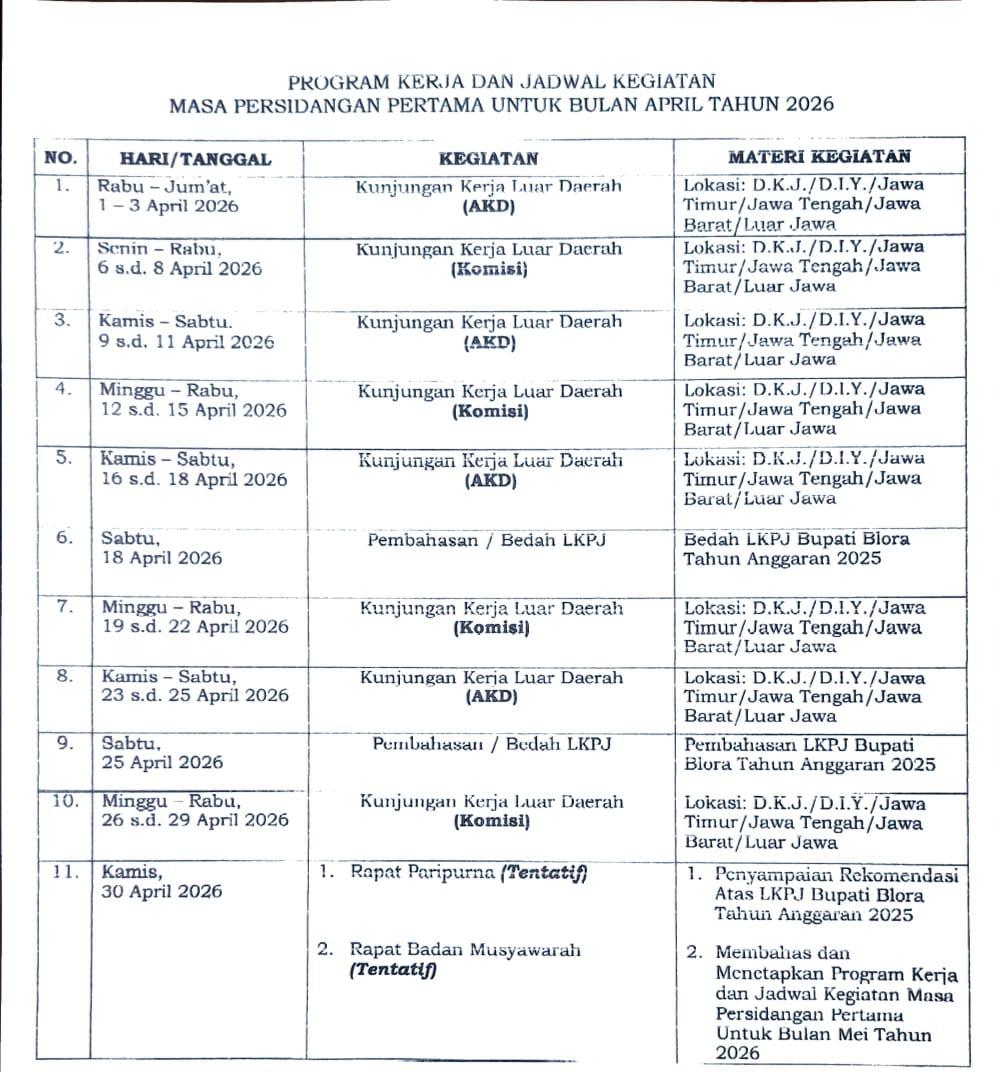 Melihat jadwal kegiatan bulan April 2026, kita patut takjub pada stamina fisik para legislator ini yang seolah memiliki energi tanpa batas untuk meninggalkan konstituennya. Dari tanggal 1 hingga 29 April, agenda mereka nyaris didominasi sepenuhnya oleh Kunjungan Kerja Luar Daerah, mulai dari tingkat Alat Kelengkapan Dewan hingga Komisi.
