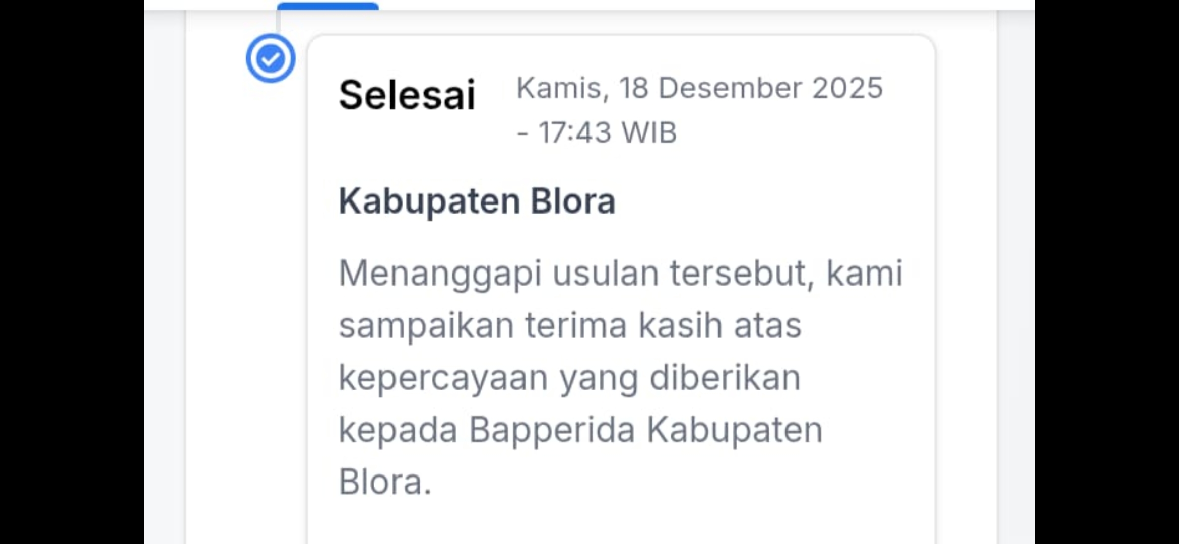 Jawaban tersebut disampaikan melalui sistem pengaduan publik dan tercatat pada Kamis, 18 Desember 2025 pukul 17.43 WIB, dengan status selesai. Selasa, (23/12/2025).