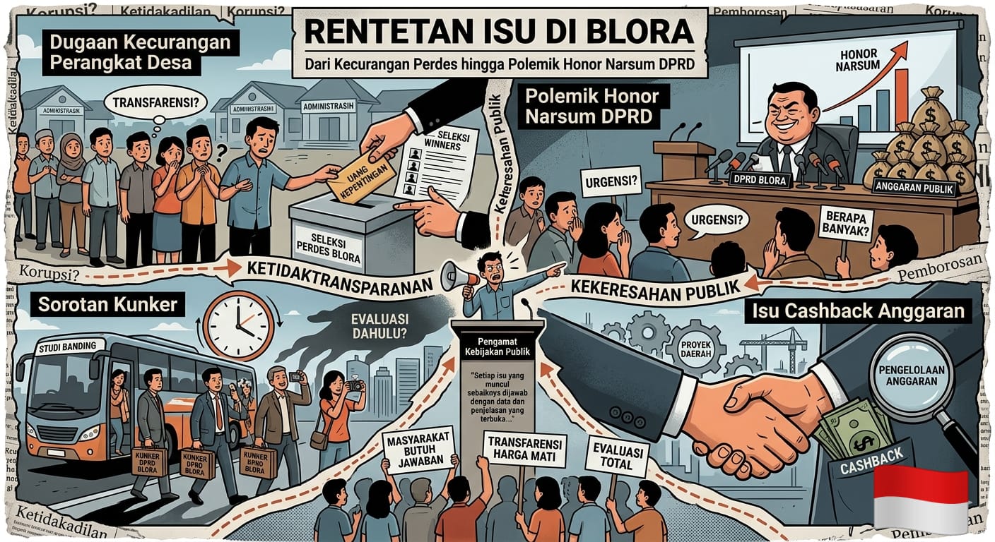 Blora, Tuturpedia.com – Sejumlah persoalan yang mencuat di Kabupaten Blora belakangan ini menjadi catatan serius publik. Mulai dari menguapnya kembali dugaan kecurangan dalam proses pengisian perangkat desa, polemik honor narasumber (narsum) di DPRD, hingga sorotan terkait kegiatan kunjungan kerja (kunker) dan isu cashback anggaran. Sabtu, (14/03/2026).