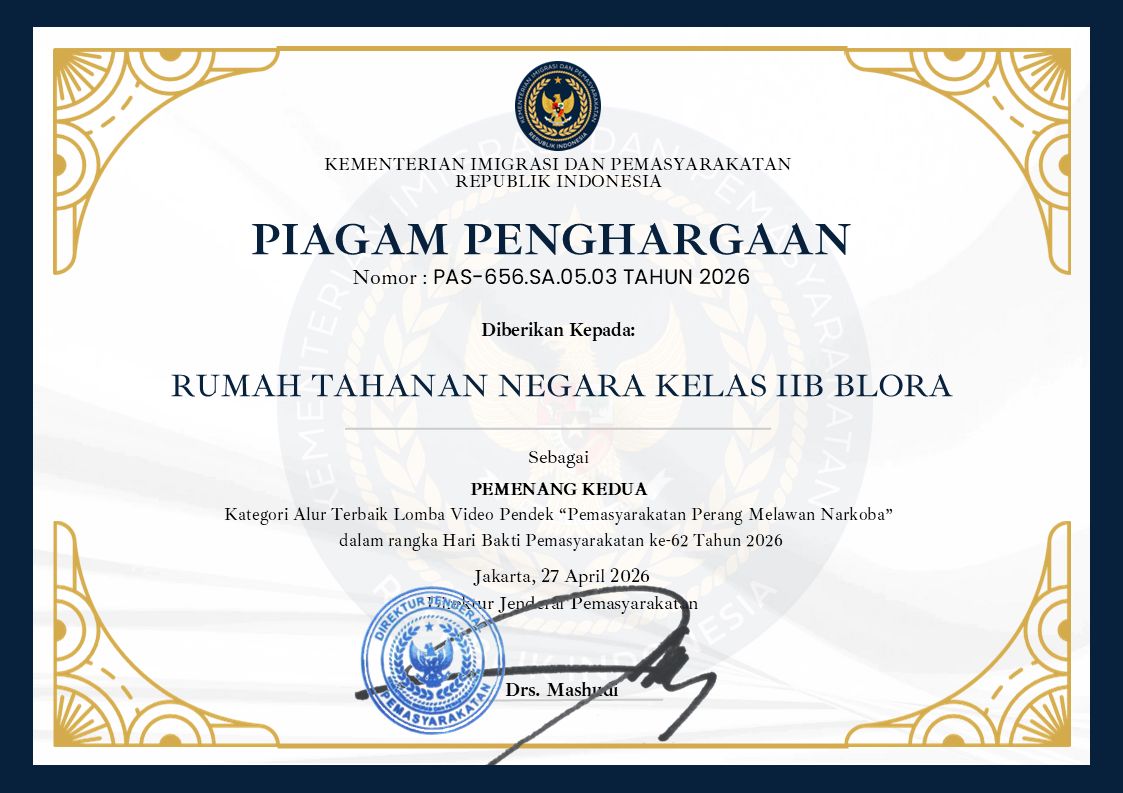Blora, Tuturpedia.com – Rumah Tahanan Negara (Rutan) Kelas IIB Blora kembali menorehkan prestasi membanggakan di tingkat nasional. Dalam rangka Hari Bhakti Pemasyarakatan ke-62 Tahun 2026, Rutan Blora berhasil meraih penghargaan pada Lomba Video Pendek bertema “Pemasyarakatan Perang Melawan Narkoba” dengan kategori Alur Terbaik (Terbaik II).