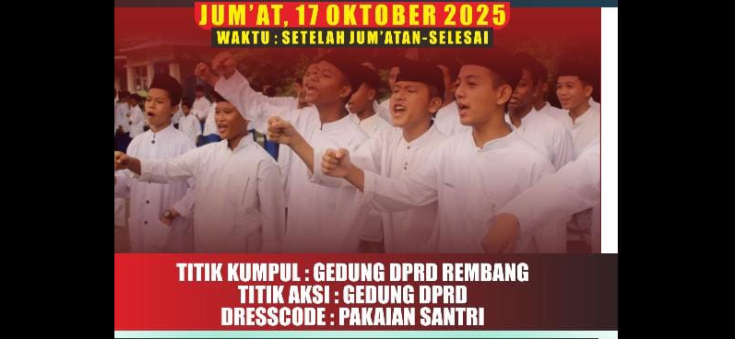 Berdasarkan pamflet seruan aksi, massa santri memulai titik kumpul di Gedung DPRD Rembang dan bergerak menuju titik aksi yang juga berlokasi di Gedung DPRD Rembang. Kegiatan dimulai setelah waktu salat Jumat dan dijadwalkan hingga selesai.