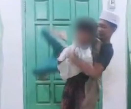 Dalam video itu, tampak sang guru yang mengenakan sarung dan peci tiba-tiba mengangkat tubuh mungil santrinya dan membantingnya dengan keras. Sang anak yang tak berdaya hanya bisa terduduk lemas setelah menerima perlakuan kasar tersebut.