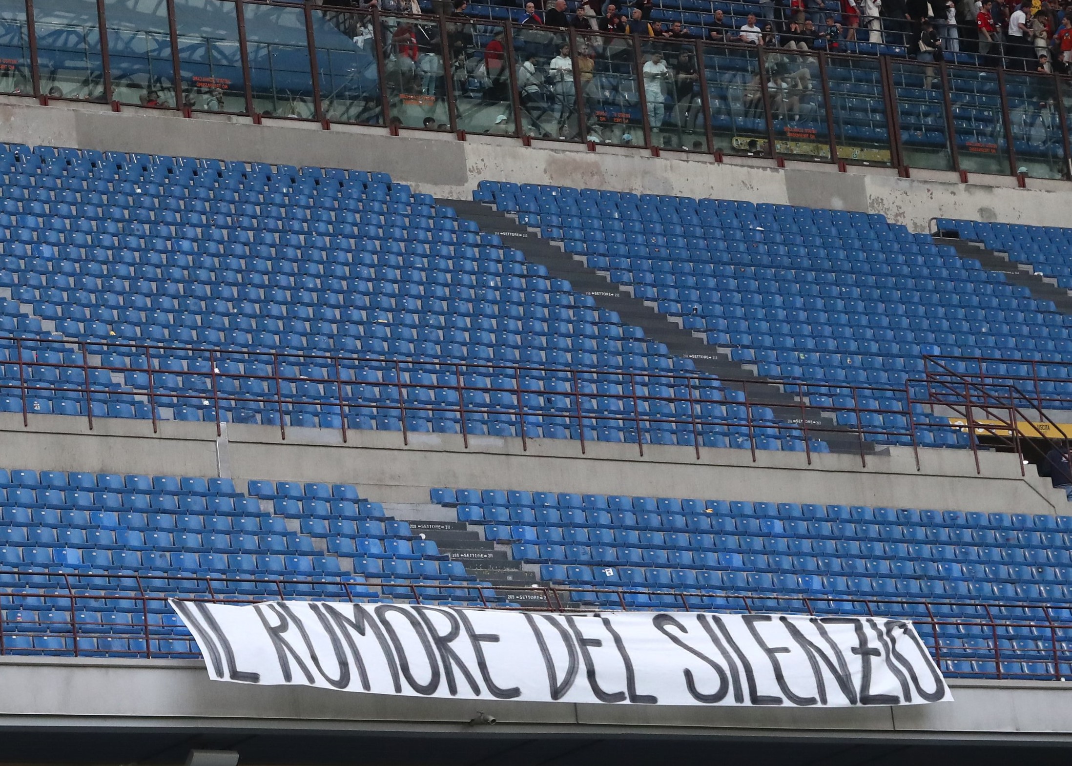 Lantas ada satu spanduk lagi yang ditinggalkan oleh pendukung Milan dan paling mencuri perhatian. Pasalnya, dalam spanduk itu tertulis Il Rumore del Silenzio alias the sound of silence, atau suara kesunyian.