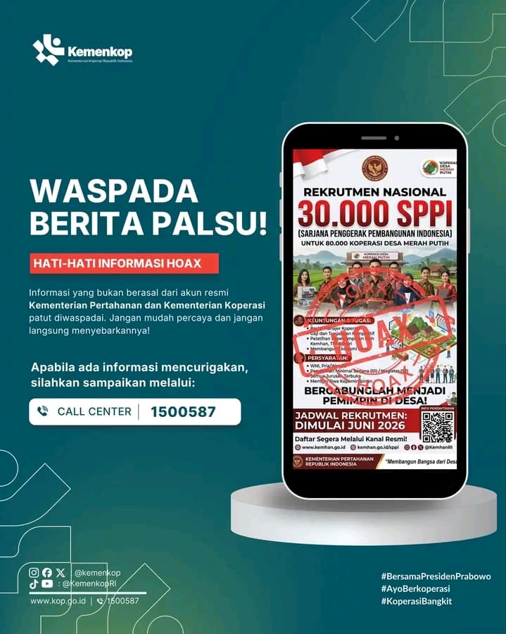 Jakarta, Tuturpedia.com– Belakangan ini beredar sebuah poster digital yang menginformasikan adanya rekrutmen nasional besar-besaran untuk 30.000 posisi Sarjana Penggerak Pembangunan Indonesia (SPPI). Poster tersebut mencatut logo Kementerian Koperasi (Kemenkop) dan Kementerian Pertahanan (Kemhan) RI, serta menjanjikan penempatan untuk 80.000 Koperasi Desa Merah Putih.